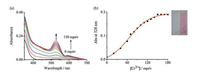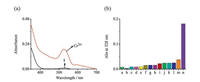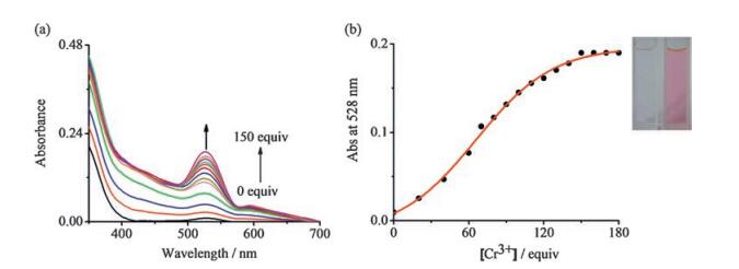 | Fig. 2. . (a) Absorption titration spectra of 1 (1.0 × 10-5 mol/L) in the presence of varying concentrations of Cr3+ in CH3CN/Tris-HCl (0.01 mol/L, pH 7.4; v/v = 9:1); (b) Absorbance of 1 (1.0 × 10-5 mol/L) at 528 nm as a function of varying concentrations of Cr3+; insert: Picture of compound 1 (left) and compound 1 upon the addition of Cr3+ (150 × 10-5 mol/L) (right). | |