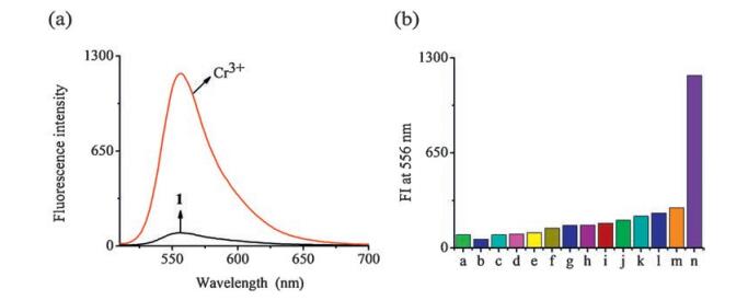 | Fig. 3. (a) Fluorescence emission spectra of 1 (1.0 × 10-5 mol/L) in CH3CN/Tris-HCl (0.01 mol/L, pH 7.4, v/v = 9:1) with 150 equiv. of Cr3+; (b) fluorescence intensity of 1 (1.0 × 10-5 mol/L) at 556 nm after addition of 150 equiv. selected ions. (a: blank, b: Ag+, c: Na+, d: K+, e: Li+, f: Hg2+, g: Cd2+, h: Cu2+, i: Pb2+, j: Co2+, k: Zn2+, l: Ni2+, m: Fe3+, n: Cr3+). | |