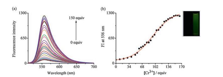 | Fig. 4. (a) Fluorescence titration spectra of 1 (1.0 × 10-5 mol/L) in the presence of varying concentrations of Cr3+ in CH3CN/Tris-HCl (0.01 mol/L, pH 7.4, v/v = 9:1). Excitation wavelength was 495 nm; (b) Fluorescence intensity of 1 (1.0 × 10-5 mol/L) at 556 nm as a function of varying concentrations of Cr3+; insert: Fluorescence picture of compound 1 (left) and compound 1 upon the addition of Cr3+ (150 × 10-5 mol/L) (right). | |