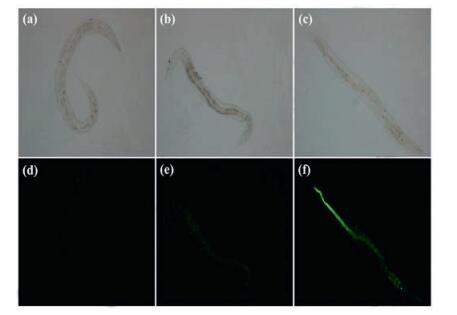 C. elegans larvae at developmental stage 4 (L4) were incubated in Petri dishes filled with M9 buffer, which contained 1 (1.0 × 10-5 mol/L), at 20 ℃ for 2 h. Almost no fluorescence could be observed in this case (Fig. 5d). Very weak fluorescence was observed in the pretreated nematodes until the concentration of Cr3+ reached 75 ×10-5 mol/L (Fig. 5e). With the dose of Cr3+ was increased, fluorescence emission became brighter accordingly. Green fluorescence emission color was mainly observed in the intestinal part of the pretreated nematodes (Fig. 5f). It suggested that the aggregation of exogenous Cr3+ mainly locates in the intestine of C. elegans. These results showed that 1 is a good bonding ligand for Cr3+ and it could be used for fluorescence imaging and monitoring intracellular Cr3+ in C. elegans.