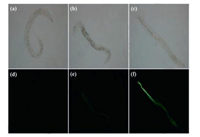 | Fig. 5. Fluorescent imaging (bottom) and phase contrast (top) for Cr3+ in C. elegans. (a) with 10-5 mol/L of 1 only; (b) with 75 ×10-5 mol/L of Cr3+ for 3 h and 10mmol/L of 1 for 2 h; (c) with 150 × 10-5 mol/L of Cr3+ for 3 h and 10mmol/L of 1 for 2 h. | |