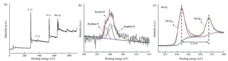 | Fig. 3. XPS spectrum of MnO2(57%)/N-UCNs (a), fitted high-resolution XPS spectra of N 1s (b) and Mn 2p (c) in MnO2(57%)/N-UCNs. | |