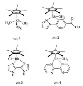 As shown in Fig. 1, different from other reported catalysts which bear the pincer-type ligands [22-25], the central rhodium of the four catalysts all bears one Cp* ligand, and ligands on the remaining empty coordination numbers are different from each other. Three null coordination of cat.1 are filled with one NH3 and two H2O molecules, respectively. 4-(1H-Imidazol-1-yl) benzoic acid relies on the nitrogen of the imidazolyl to connect with Rh-Cp*, and the rest of the coordination is filled with one water molecule. N, N-Chelate bond were generated by the Rh-Cp* and ligands of cat.3 and cat.4. 2, 2'-Bipyrimidine is connected to rhodium by two nitrogen on the same side, and water molecule acts as another ligand. The 2, 2'-biimidazole and 2, 2'-bipyrimidine are all chelating reagent, which could connect to Rh-Cp* strongly.