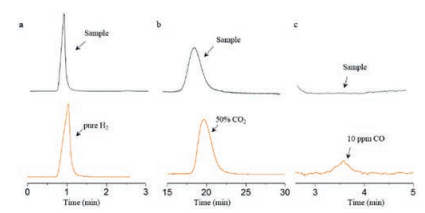 We used GC to measure the composition of the evolved gas from the methanol reforming reaction. No CO was detected (below detection limit) in the generated gas (Fig. 3c). Besides hydrogen, the only detectable gas was CO2 (Fig. 3a and b). Hydrogen generation without CO is especially useful to the high performance of PEMFC.