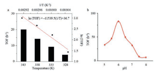 Fig. 4a shows thathigher temperature couldincrease the reaction rate. The TOF value reached up to 20 without any additional material required at 343 K. Moreover, the apparent activation energy (Ea) could be achieved by fitting the linear correlation between ln(TOF) and 1/T accurately. The Ea for methanol reforming was 96.0 kJ/mol. As exhibited in Fig. 4b, the effect of buffer pH on the methanol dehydrogenation was observed in the pH range from 5 to 8, which were adjusted by phosphate buffer solution. At such relatively low temperatures, the hydrogen evolution rate increased gradually with elevating the buffer pH from 5 to 6 and presented a maximum TOF of 83.2 h-1 at pH 6. Further increasing the pH to 8 dramatically decreased the reaction rate.