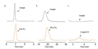 | Fig. 3. GC spectra of the gaseous product from methanol reforming reaction. (a) H2; (b) CO2; (c) CO. Orange curves represent the standard gas samples. Reaction conditions: methanol (1.71 mL), deionized H2O (0.29 mL), cat.1 (3.4 μmol), T = 70 ℃. The evolved gas for gas chromatogram measurement was collected after reacting 1 h. | |