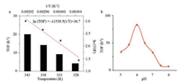 | Fig. 4. (a) Effect of the temperature on the catalytic hydrogen generation; (b) Effect of the initial buffer pH on the hydrogen evolution. Reaction conditions: (a) methanol (1.71 mL), deionized H2O (0.29 mL), cat.1 (3.4 μmol). (b) Methanol (1.71 mL), deionized H2O (0.19 mL), buffer solution (20 mmol/L, 0.1 mL), cat.1 (3.4 μmol), T = 70 ℃. | |