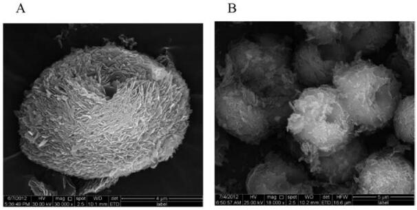 2. Results and discussion 2.1. Morphological characterization of 3D-4MgCO3·Mg(OH)2·4H2O and 3D-4MgCO3·Mg(OH)2·4H2O-Au NPs inorganic hybrid compositeSEM is a powerful tool to characterize the morphology of different composites. Fig. 1 shows the SEM images of the porous hydromagnesite microspheres (3D-4MgCO3·Mg(OH)2·4H2O) microparticles before (Fig. 1A) and after loading of Au NPs (Fig. 1B). It was obvious to see that the prepared 3D-4MgCO3·Mg(OH)2·4H2O microparticles possessed porous rosette or three-dimension nest structure, large surface area and a uniformly multilayered structure, which could highly strengthen the amount and stability of the immobilized Au-NPs. After the adsorption of Au NPs, 4MgCO3·Mg(OH)2·4H2O microparticles retained the original three-dimension nest structure but became relatively smooth (Fig. 1B).