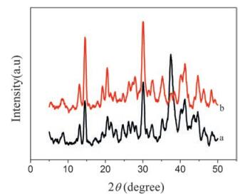 | Fig. 2. XRD pattern of 3D-4MgCO3·Mg(OH)2·4H2O (a) and 3D-4MgCO3.Mg (OH)2 4H O-Au NPs inorganic hybrid composite (b). | |