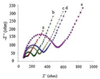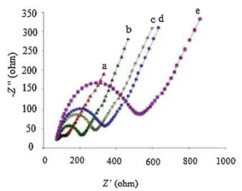 | Fig. 4. Nyquist plots of impedance spectra obtained in 5 mmol/L [Fe(CN)6]3-/4-, (a) bare GCE, (b)3D-4MgCO3·Mg(OH)2·4H2O-Au NPs/CHIT/GCE, (c) aptamer Ⅰ/3D-4MgCO3·Mg(OH)2·4H2O-Au NPs/CHIT/GCE, (d)PDGF/aptamer Ⅰ/3D-4MgCO3.Mg(OH)2.4H2O-Au NPs/CHIT/GCE, (e) aptamer Ⅱ/PDGF/aptamer Ⅰ/3D-4MgCO3.Mg (OH)2.4H2O-Au NPs/CHIT/GCE. | |