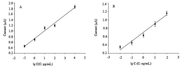 | Fig. 6. The calibration curve of the aptasensor based on 3D-4MgCO3·Mg(OH)2·4H2O-AuNPs inorganic hybrid (A) and only Au NPs (B). Each data point is the average of three independent assays. | |