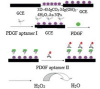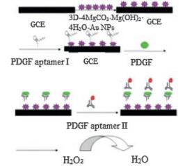 Based on the reasons mentioned above, we present a simple preparation and characterization of porous 3D-4MgCO3·Mg (OH)2·4H2O-Au NPs inorganic hybrid composite for the first time in this work. 3D-4MgCO3·Mg(OH)24H2O has a high mechanical strength and large surface area which can load abundant Au NPs, also can provide a friendly environment for aptamer to retain their activity. Pt-Au alloy nanoparticles were also synthesized by a facile pathway. In the presence of chitosan (CHIT), 3D-4MgCO3·Mg (OH)2·4H2O-Au NPs were modified on the surface of glassy carbon electrode. The thiolated PDGF aptamer Ⅰ was then immobilized on the electrode surface via self-assembled technology. In addition, PDGF aptamer Ⅱ was labeled with Pt-Au bimetallic nanoparticles. Since PDGF has two binding sites, one site binds to the aptamer immobilized on modified GCE and another site binds to the aptamer Ⅱ which has been labeled with Pt-Au NPs. The PDGF aptamer Ⅱ/PDGF/PDGF aptamer Ⅰ "sandwich" structure was finally formed. Because the Pt-Au bimetallic nanoparticles have great electrocatalytic activity for reduction of H2O2, quantitative determination of PDGF could be achieved by detecting the reduction current of H2O2. This method is novel, sensitive, stable and practicable.