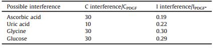 To evaluate the reproducibility of the aptasensor, a series of measurements were prepared for the detection of 1 ng/mL PDGF. The relative standard deviation (RSD) was 4.8% for five parallel measurements, indicating that reproducibility of the proposed aptasensor was acceptable.