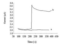 | Fig. 5. The different catalytic efficiency of 3D-4MgCO3·Mg(OH)2·4H2O-AuNPs inorganic hybrid (a)and Pt-Au bimetallic nanoparticles (b) to the reduction of H2O2 at -0.1 V. | |