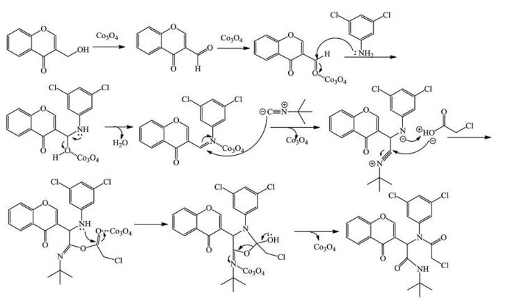 2. Results and discussionInitial exploratory studies among 3-(hydroxymethyl)-4H-chromen-4-one (1a), 3, 5-dichloroaniline (2a), chloroacetic acid (3a) and tert-butyl isocyanide (4) in acetonitrile under reflux condition without catalyst did not produce the desired Ugi adduct. When the reaction was performed in the presence of T3P, under the same reaction conditions, 31% of the desired Ugi adduct (5a) is obtained. However, we failed to obtain noticeable yields when the reaction was carried out in the presence of HIO3, Chloramine-T with ZnBr2, dimethyl dioxirane, and sodium hypochlorite. Later, we turned our attention to the metal catalysts and among the metal catalysts tried, Bi2WO6 and 5 mol% nano Co3O4 resulted in 10% and 55% of 5a, respectively.
