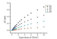 | Fig. 4. Change in 1H chemical shift of partial proton signals of receptor 2 in 15:85 (v/ v) DMSO-d6/CDCl3 upon increasing the concentration of chloride anions at 298 K. [2] = 1 mmol/L. | |