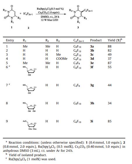 With the optimum reaction conditions in hand (Table 1, entries 16), a variety of uracils, uracil nucleosides and perfluoroalkyl iodines were investigated, and the representative results are illustreted in Table 2. Uracil gives the product in 82% yield which indicate the amide have little influence on the reaction efficiency (3b). Other functional groups such as methyl, ester are all compatible with the reaction condition (3c, d), and give the product in moderate yield. Perfluorobutyl iodine was also a sutable reaction partner and good yield canbe obtained (3e). The unprotected hydroxy groups have negative effect on the reaction efficiency, and only moderate yields were get when uridine and deoxyuridine were treated (3f-h) while 2', 3', 5'-tri-O-acetyluridine gives the product in excellent yield (3i).