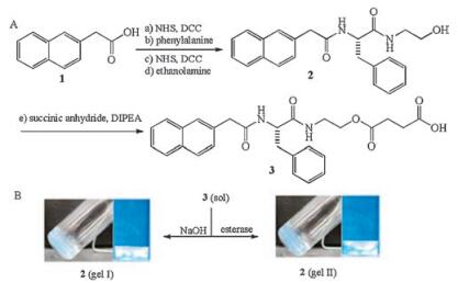| Fig. 5. (A) Synthesis route to 2 and 3. (B) Reactions to convert the precursor (3) to the hydrogelator (2) under basic conditions (pH 9) to afford gel Ⅰ or via hydrolysis catalyzed by esterase (1 U/μL, 10 μL) at pH 7.5 to give gel Ⅱ (optical images: left, normal; right, through a pair of crossed polarizers). Reused with permission [51]. Copyright 2011, American Chemical Society. | |