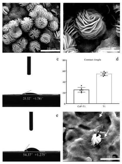 Moreover, the contact angle was tested to measure the surface wettability of the novel coating. Surface wettability of biomaterials, as an important role in surface modification, determines the biological cascade of the biomaterial/host interface. In other words, it influences the cell spreading and adhesion in a great way [32, 33]. As shown in Fig. 4c-e, the contact angle of calciumphosphate nanoflowers coated titanium surface (c) and contact angle of titanium surface after alkali-treatment (d) were significantly different (P < 0.0001). The contact angles for coated group were 25.32 ± 1.781º (Fig. 4c), while in the alkali-treatment group, the contact angles were 54.37 ± 1.275º. This result supports that the flower-like coating consisting of calcium-phosphate nanosheets may provide a hydrophilic surface thus enhance cell affinity.