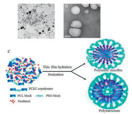 In present work, a series of amphiphilic PCEC triblock copolymers were synthesized with various weight ratios of PCL/ PEG by ring-opening polymerization of PEG and ε-CL monomer with Sn(Oct)2 as catalyst. The results by FT-IR, 1H NMR, GPC and DSC indicated that PCEC copolymers were synthesized successfully. The chemical synthesis process can be controlled to obtain the desirable chain length of the copolymers and PCL/PEG block ratio. In our work, both series of blank or drug-loaded PCEC polymeric micelles and polymersomes were fabricated by the thin-film hydration and ultrasonic dispersion method. As the ratio of PCL/ PEG block weight was less than 2, the PCEC copolymers formed polymeric micelles and polymersomes, respectively, which was in good agreement with literature reports. TEM image confirmed that most of the nanoparticles have a discrete spherical shape and a uniform size. The particle size and distribution, and zeta potential of blank and drug-loaded nanoparticles were measured by DLS. These results indicated that the particle sizes of nanoparticles were dependent on the lengths of PCL and PEG blocks. All the nanoparticles have negative zeta potentials. The results of drug loading capacity and cellular uptake experiment showed that both polymeric micelles and polymersomes have high drug-loading efficiency and cellular uptake efficiency. Based on above findings, we conclude that PTX-loaded polymeric micelles and polymersomes may display great potential as the drug delivery vehicles for solubilization of hydrophobic drugs.