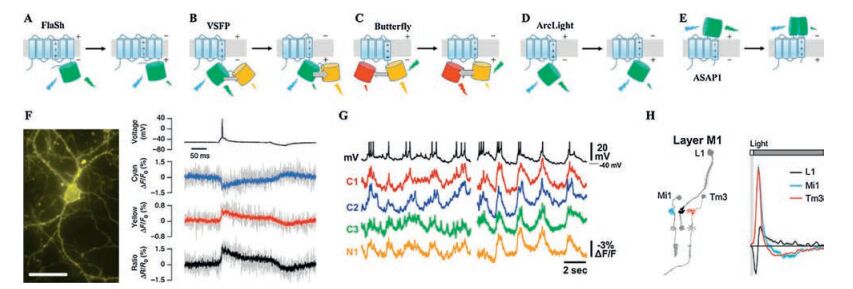 | Fig. 1. Design and applications of GEVIs based on voltage-dependent conformational changes. A) The first generation voltage indicator, FlaSh, was built upon voltage-gated potassium channel. B) VSFP2 series are ratiometric reporters consisting of a FRET pair fused to VSD. C) VSFP Butterfly has FPs fused separately to the two termini. D) ArcLight is a monochromic GEVI with sensitive voltage response. E) ASAP1 couples the conformational changes in VSD to cpGFP. F) VSFP2.3 reports membrane voltage transients in hippocampal pyramidal neurons through differential two-color fluorescence imaging. Reprinted with permission [2]. Copyright 2010, Nature Publishing Group. G) Simultaneous recording of multiple neurons with ArcLight in Drosophila brain. Reprinted with permission [3]. Copyright 2013, Elsevier Inc. H) Voltage imaging with ASAP in Drosophila visual system reveals the transformation of voltage responses between pre-synaptic axons and post-synaptic dendrites.Reprinted with permission [4]. Copyright 2016, Elsevier Inc. | |