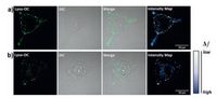 | Fig. 7. (a) Fluorescence confocal imaging of MCF-7 cells stained with Lyso-OC (Probe 47) before being induced by HBSS. (b) Fluorescence confocal imaging of MCF-7 cells stained with Lyso-OC in autophagy. λex = 760 nm, λem = 490-550 nm. The scale bar represents 20 mm. Copied with permission [104]. Copyright 2017, Royal Society of Chemistry. | |