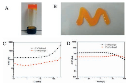 | Fig. 1. Gelation property of AA-Azo-EG6. A) A photograph showing the gel formation in an inverted tube. B) A M-shaped hydrogel produced by syringe injection. C) Oscillatory rheology frequency sweep of the gel at a 0.1% strain. D) Oscillatory rheology strain sweep of the gel at a 10 rad/s frequency. | |