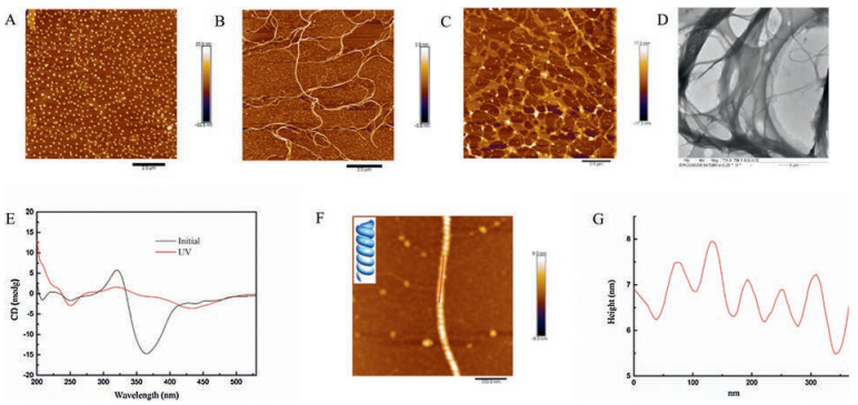 | Fig. 2. Self-assembly of AA-Azo-EG6. A-C) AFM images of AA-Azo-EG6 at 0.1 (A), 0.5 (B) and 1.0 (C) mg/mL in ultrapure water. D) TEM image of AA-Azo-EG6 at 1.0 mg/mL. (E) CD spectroscopy of AA-Azo-EG6 at 0.5 mg/mL in degassed ultrapure water. F-G) Magnified AFM image (F) and height profile (G) of the superhelical nanofiber; sample was prepared at 0.5 mg/mL and scale bar = 350 nm. | |