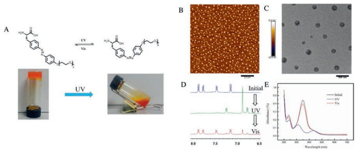 | Fig. 3. The photo-responsiveness of molecular structure. A) A photograph show gel-sol transition under UV irradiation (intensity: 1 W/cm2). AFM (B) and TEM (C) images of AA-Azo-EG6 under UV irradiation at 1.0 mg/mL. D) 1H NMR spectra of AA-Azo-EG6 in DMSO-d6 treated with UV and vis irradiation. E) UV–vis spectra of AA-Azo-EG6 solution at 0.01 mg/mL treated with UV and vis irradiation. | |