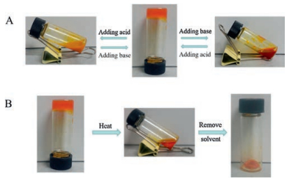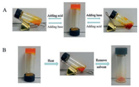 | Fig. 4. Photographs of AA-Azo-EG6. A) The reversible pH-triggered gel-sol transition. B) The thermo-triggered gel-sol transition. | |