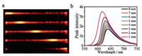 | Fig. 4. (a) Fluorescence microscopy images collected upon excitation of the identical crystal of 1 at five different positions; (b) Emission spectra measured at the end of a single crystal of 1 with the distance between the end and the excitation point in the range of 1–8 mm. | |