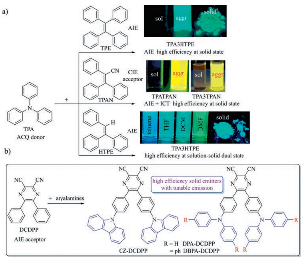 Furthermore, the transformation of ACQ chromophores into AIE luminogens (AIEgen) is developed by simple decoration of ACQ dyes with AIE units in 2010 [22], thus paving the way for the construction of diverse high efficiency solid luminogens. Notably, it also affords a facile approach to the construction of multifunctional luminogens through incorporation of other functional moieties like electron-donating (D) [22, 23] or electron-accepting (A) groups (Fig. 1a) [24]. Later, through introduction of typical D and A units, efficient solid luminophores with both AIE and intramolecular charge transfer (ICT) characteristics were obtained [25]. Further functionalization of triphenylamine (TPA) with a typical AIE structure, namely triphenylethylene (HTPE) [26], results in solution-solid dual state efficient luminogens owing to the conjugation-induced rigidity (CIR) effect in twisted molecules (Fig. 1a) [27]. Derived from these previous results, it is envisioned that efficient solid luminogens with tunable emission colors can be constructed through combination of D and A building blocks accompanying the incorporation of AIE moieties. Modulation of the strength of the D and A groups can readily tune the emission color [25, 28, 29], whereas AIE units may offer the resulting compounds with efficient solid emission [22, 24].