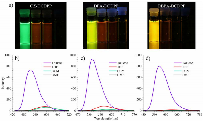 | Fig. 2. (a) Photographs taken under 365 nm UV illumination and (b-d) emission spectra of corresponding solutions of (b) CZ-DCDPP, (c) DPA-DCDPP and (d) DBPA-DCDPP in different solvents (from left to right: toluene, THF, DCM and DMF). Concentration = 10μmol/L. | |