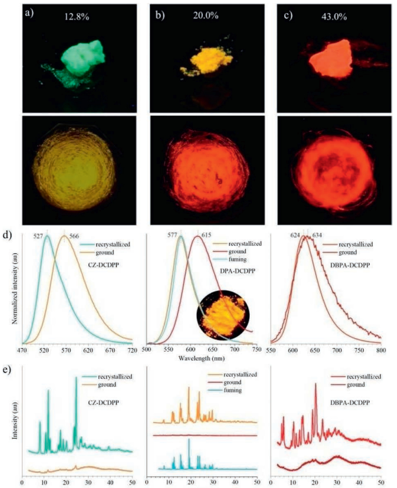 | Fig. 3. (a–c) Photographs of recrystallized (upper) and ground (lower) solids of (a) CZ-DCDPP, (b) DPA-DCDPP and (c) DBPA-DCDPP under 365 nm UV illumination. (d) Emission spectra and (e) XRD patterns of different solid powders of CZ-DCDPP, DPA-DCDPP and DBPA-DCDPP. Emission efficiencies of the recrystallized powders are indicated in (a). The inset in (d) is the photograph of the fumed solid of DPA-DCDPP under 365 nm UV illumination. | |