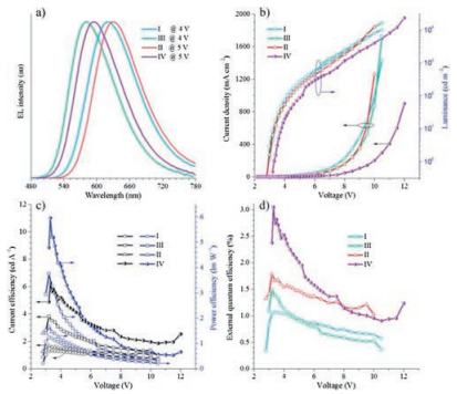 | Fig. 4. (a) EL spectra of devices Ⅰ–Ⅴ based on DPA-DCDPP and DBPA-DCDPP. (b) Current density—voltage—luminance plots, (c) current efficiency—voltage—power efficiency plots, and (d) external quantum efficiency—voltage plots of their nondoped (Ⅰ and Ⅱ) and doped (Ⅲ and Ⅳ) multilayer OLED devices. Device configurations are given in Table 1. | |