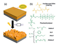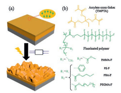 | Fig. 1. (a) The whole strategy to prepare the anti-reflection surface coating with wrinkle pattern. (b) Chemical structures of acrylate cross-linker and fluorinated copolymers used in this work. | |