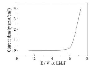 The electrochemical stability of 1.0mol/L LiTFSI-CP electrolyte was evaluated by the LSP test, which was conducted in a threeelectrode cell under O2 atmosphere. As shown in Fig. 2, it can be found that there is no peak formed until 5 V, which indicated the CP based electrolyte is electrochemically stable enough in O2 atmosphere. Furthermore, ionic conductivity of the CP based electrolyte is 0.9 mS/cm at room temperature.