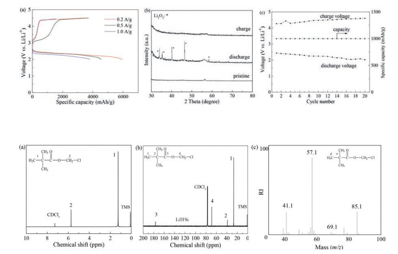 In order to evaluate the chemical stability of the CP based electrolyte, we measured the electrolyte after 13 cycles in the Li-O2 battery by NMR and MS.As shown in Figs. 4a and b, there are no new peaks formed compared to the pristine CP as shown in Fig. 1. Mass spectrum is also applied to analyze the stability of the electrolyte, as shown in Fig. 4c. It is noticeable that CP does not decompose after 13 cycles of charge-discharge, which proves the satisfactory stability of this electrolyte. These results further demonstrated that the CP based electrolyte has a good chemical stability against the superoxide radicals during the charge and discharge process of Li-O2 battery. In addition, we also found the Li-O2 battery showed a performance decay since there is an increasing voltage gap between discharge and charge terminal voltages with increasing cycles. We think the main reasons of this decay is that both the MWCNTs and PVDF binder from the cathode will be attacked by the superoxide radicals and form some byproducts [3].