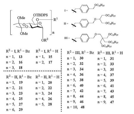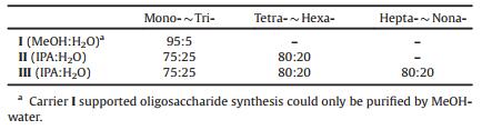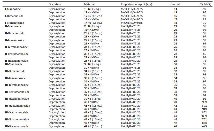 The single chain in compound 1 had a good solubility in isopropanol, which would cause the yield decreasing. So the carrier Ⅰ (Fig. 2) supported oligosaccharide synthesis could only be purified by MeOH-water, while isopropanol was used for purification during the assembly supported by Ⅱ and Ⅲ because the excess donors and their rearrangement byproducts had better solubility than that in methanol (Table 2).