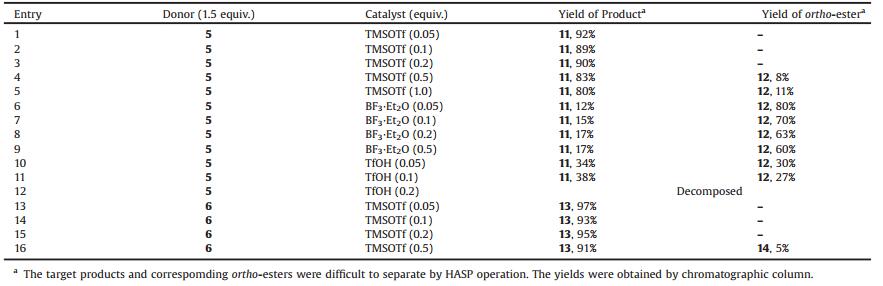 At first, compound 4 was synthesized as the donor for HASP strategy. But its reactivity was too high that so many byproducts generated, especially the ortho-ester 8 (Scheme 1). Then we synthesized donors 5 and 6 in order to decrease the byproducts. With series of attempts, we found that donor 6 had a suitable reactivity and better application for HASP strategy with 0.05 equiv. TMSOTf as catalyst, which avoided producing ortho-ester 14 (Table 1, entry 13).