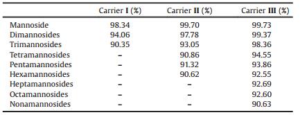 At present, the outcome analysis of HASP purification were always implemented by TLC and NMR, both of which could only afford only qualitative result. So we established a new system using HPLC to characterize the purification result quantitatively. The purity of all oligosaccharides gained from HASP was analyzed by HPLC (SiO2 as stationary phase, n-hexane-THF as mobile phase) and the results were summarized in Table 4. Purity of tri-mannosides with carrier Ⅰ was 90.35%, limited by its absorbability with ODS. But acceptor 1was easy to obtain, which made it suitable for rapid assembly of structurally simple oligosaccharides. For carrier Ⅱ, the purity of tri-mannosides was better and the purity of hexa-mannosides was 90.62%. The purity of tri-mannosides and hexa-mannosides was increased with carrier Ⅲ, by which we got nona-mannosides with a purity of 90.63%. Carrier Ⅲ had a better applicability for HASP because of its high yield, high purity and large scale of oligosaccharides.
