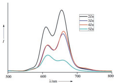 | Fig. 2. Fluorescence spectra of 2Zn (black line), 3Zn (blue line), 4Zn (red line) and 5Zn (dark cyan line) in CH2Cl2. | |
