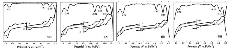 | Fig. 3. CV and DPV measurements of 2Ni, 3Ni, 4Ni and 5Ni in o-dichloro-benzene (o-DCB) containing 0.1 mol/L TBAP. | |