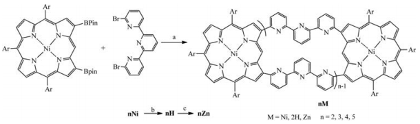 Electronically interactive multiporphyrinic systems have attracted considerable attention in recent years, largely because of their potential applications in optoelectronic devices, sensors, photovoltaic devices, nonlinear optical (NLO) materials, photodynamic therapy (PDT) pigments [1] and other applications [2]. The well-elucidated structure of the light-harvesting complex (LH2) [3-5] and its unusual light-harvesting ability have prompted chemists to synthesized cyclic porphyrin arrays to study the excitation energy transfer (EET) and electronic coupling along the wheel [6]. Cyclic porphyrin arrays are often constructed by means of covalent bond, noncovalent bonds or metal coordination bonds [7-11]. Among those, covalently bonded arrays are structurally robust but difficult to synthesize. Covalently bonded cyclic porphyrin oligomers are often linked by 1, 3-butadiyne [12, 13], 2, 5-thienyl [14, 15], 2, 5-pyrrolyl [16, 17], 2, 6-pyridyl [18], azobenzene [19], and other spacers [20]. As rare examples, The Osuka group has reported the synthesis of directly meso to meso linked cyclic porphyrin arrays as photosynthetic models through silver(Ⅰ) promoted coupling reactions of 5, 15-diaryl-substituted zinc(Ⅱ) porphyrin [21]. We reported directly β to β cyclic porphyrin arrays through Suzuki-Miyaura coupling reactions in 2014 [22]. Those cyclic porphyrin arrays display large electronic interactions and energy transfer between the constituent porphyrin units. Song and Osuka have achieved the synthesis of β to β 2, 5-thienylene [14] and 2, 5-pyrrolylene-bridged [17] cyclic porphyrin oligomers through Suzuki-Miyaura coupling reactions. When they examined the Suzuki–Miyaura coupling of β, β'-diborylated Ni(Ⅱ) porphyrin with 2, 6-dibromopyridine, which provided linear oligomers as the main products [18a]. Herein, we wish to report the one-pot efficient synthesis of 6, 6"-2, 2':6', 2"-terpyridylene-bridged porphyrin nanorings through Suzuki-Miyaura coupling of β, β'-diboryl Ni(Ⅱ) porphyrin 1Ni [23] with 6, 6"-dibromo-2, 2':6', 2"-terpyridine, which is effective to construct medium to large porphyrin rings without template.