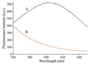 At first, two experiments were carried out to confirm the feasibility of the detection method. Fig. 1 shows the fluorescence emission spectra from samples in the absence and the presence of HA. The results demonstrated that in the absence of HA, high intensity of fluorescence was observed (maximum at ~605 nm) due to the formation of poly T-templated CuNPs (Fig. 1, curve A). In addition, in the presence of HA, a decrease in fluorescence intensity was observed, which was due to that HA could absorb Cu2+, preventing the formation of poly T-templated CuNPs (Fig. 1, curve B). These results demonstrated feasibility of the method in detection of HA.