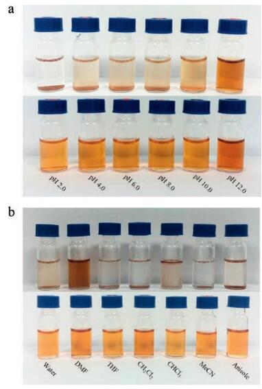 The photographs of aqueous solution of AL and AL-azo-PEG-3 at different pH were presented in Fig. 2a. The color of the AL solution has changed from orange to colorless and some flocculent sediment appeared with the pH decreasing. However, the color of AL-azo-PEG solution has slightly changed and the solution itself remained clear at a wide pH range. Therefore, the introduction of hydrophilic PEG part has greatly improved the solubility property in water. Additionally, the functionalized AL can be well dissolved in many common organic solvent, such as DMF, THF, CH2Cl2 and so on (Fig. 2b). It can be seen that the AL can only dissolved in DMF. On the contrary, after functionalized with PEG, the modified samples showed good solubility in all selected solvents.
