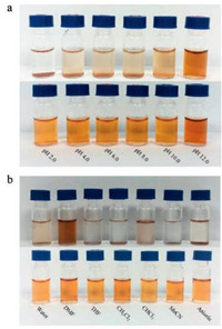 | Fig. 2. a) Aqueous solutions (1.0 mg/mL) of AL (up) and AL-azo-PEG-3 (down) at different pH, b) The solubility of AL (up) and the prepared AL-azo-PEG-3 copolymer (down) in different solvent. | |