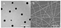 | Fig. 3. a) TEM image of the prepared AL-azo-PEG-1 aggregates and b) SEM image of electrospun nanofibers from lignin based polymer AL-azo-PEG-3. | |