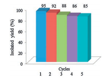 The multicomponent reaction of benzylamine, formaldehyde, phenylboronic acid and phenylpropiolic acid was performed to test the reusability of the catalyst, After each reaction, CuFe2O4 was magnetically recovered, washed with ethanol, air-dried and reused directly for the next time. As shown in Fig. 1, after five times reuse, no obvious loss of activity was observed.
