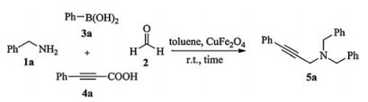 In a preliminary reaction, benzylamine (1 mmol) was treated with formaldehyde (2.5 mmol), phenylboronic acid (1.5 mmol) and phenylpropiolic acid (1.3 mmol) in the presence of CuFe2O4 nanoparticles (10 mol%) in toluene (2.5 mL) for 8 h at room temperature. The reaction conditions were optimized by varying the ratio of reactants, reaction time, and the amount of CuFe2O4. Investigation on the ratio of reactants, the best yield was obtained when benzylamine, formaldehyde, phenylboronic acid and phenylpropiolic acid proceeded under the ratio of 1:2.5:1.5:1.3 (Table 1, entry 3), while decreasing or increasing the ratio of phenylboronic acid or phenylpropiolic acid did not improve the reaction yields (Table 1, entries 1-5). While the reaction time was reduced from 8 h to 4 h, the product yield decreased from 96% to 65%. (Table 1, entries 3, 6 and 7). In the absence of the catalyst, only 6% yield was obtained. Decreasing the amount of CuFe2O4 from 10 mol% to 5 mol%, the product yield was decreased, while increasing to 15 mol%, the yield was not improved significantly (Table 1, entries 3, 8-10). Finally, the reaction conditions were optimized to be CuFe2O4 (10 mol%) as catalyst, benzylamine reacted with formaldehyde, phenylboronic acid, phenylpropiolic acid with the ratio of 1:2.5:1.5:1.3, and reaction for 8 h at room temperature (Table 1, entry 3).